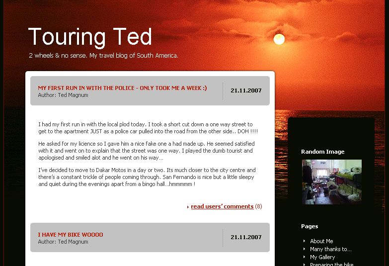 Ted, un anglais de la trentaine viens de se fairte lourder par son boulot et sa copine. Il aprt traverser l'Amérique du Sud sur un XT600E.