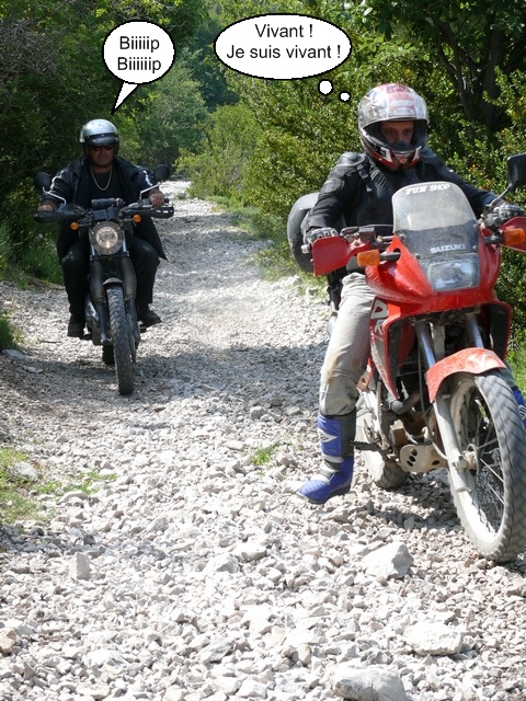 La moto bouge dans tous les sens, ça guidonne, ça dérape, je donne des coups de botte et à mis chemin ralenti trop, essaye d'accélérer ... Et me tanke! :oops: