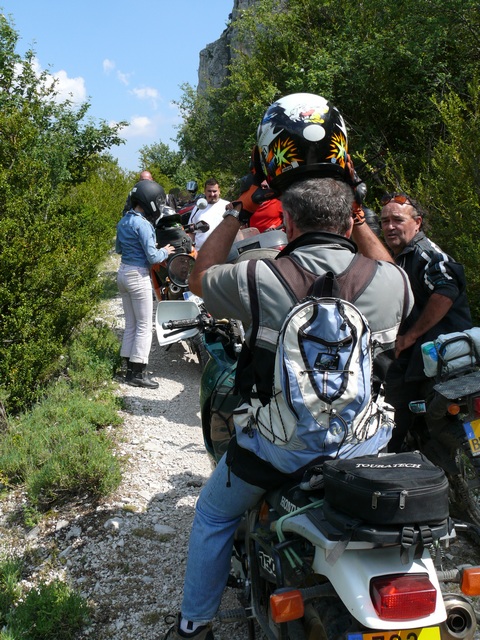 D'ailleurs avant d'arriver au sous bois j'ai eu mon premier moment de solitude de la journée : l'épingle serrée à gauche en contre bas des maisons ! :? Entre le virage super mal engagé, le rayon de braquage soudainement plus que ridicule de la Katoche, la réticence de mettre de l'angle à gauche et mon regard irrésisitiblement attiré par le vide à l'extérieur du virage, je me retrouve à l'arrêt en me demandant comment je vais m'en sortir ! :oops: En y allant tout doucement, en manoeuvrant un peu, finallement ça passe et je retrouve tout le monde au début de l'ébouli !