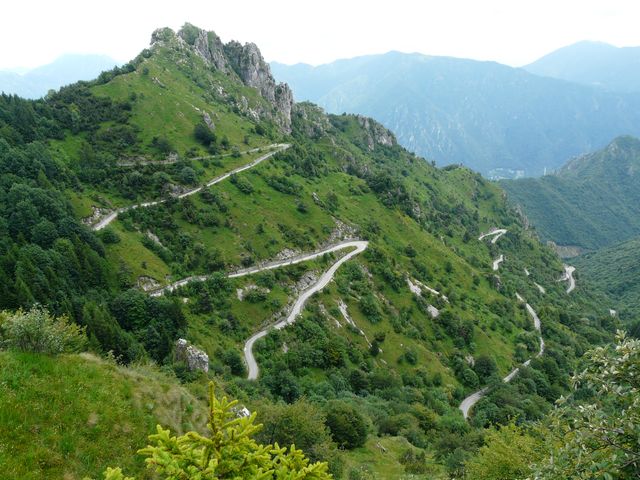 La petite route viroleuse vers Dossena, San Bartolomeo, le colle Zambla est très belle mais difficile et imprévue dans son parcours. Nous traversons les patûrages, les forêts, les villages alpins un peu délaissés jusqu'à Ponte Nossa
