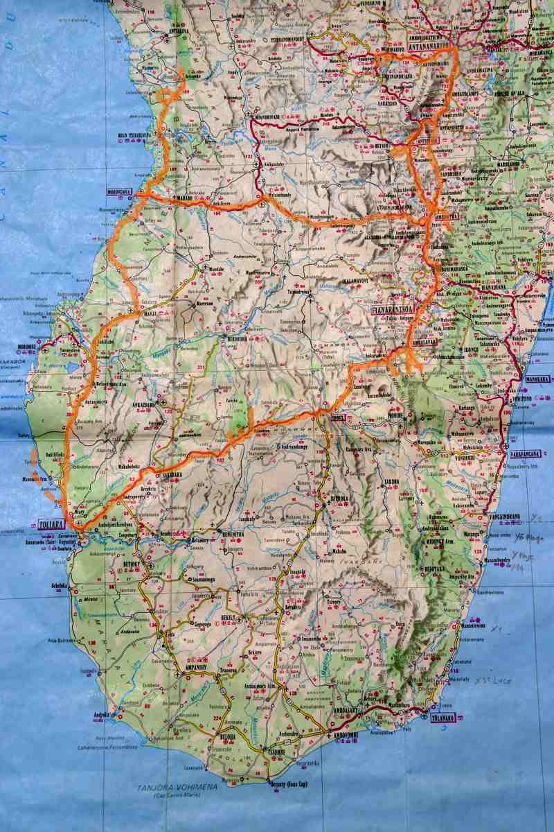 Itinéraire de Tana , en 3 semaines et env 3200 km : Ambositra, RN35, Tsinguys du Bemaraha, Morondave, Manja, Tuléar, massif Isalo, massif Andringitra, Tana, nous n’avons pas pu aller à Morombe et Andavadoaka (à cause d’un cadre cassé).en Mai, Juin 2005.