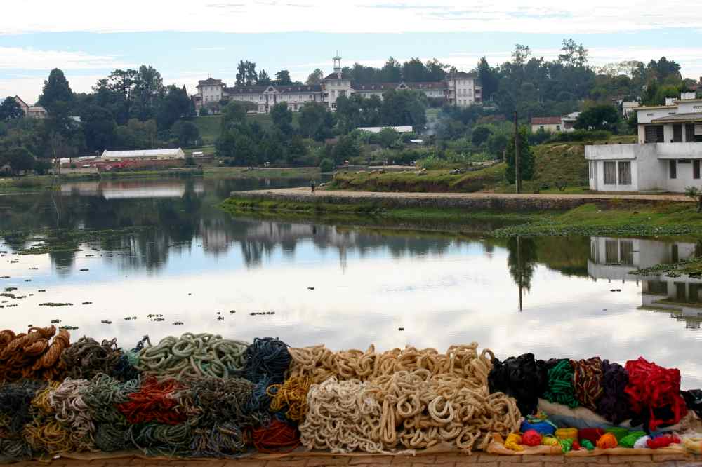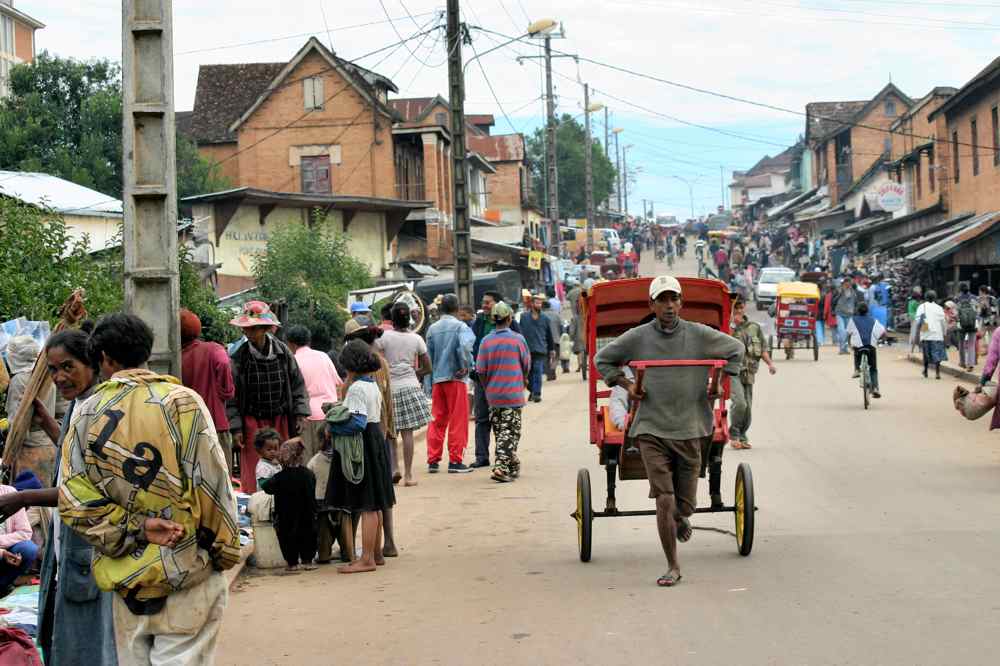 La météo est incertaine, nous partons sans bagage pour le lac Tritiva, les chemins traversent une campagne bucolique, rizières, travaux des champs, nombreux chariots tirés par des zébus, habitants sympas, souriants. Au retour nous entrons dans Antsirabe sans pouvoir éviter le marché, nous nous faufilons dans la foule sur nos motos, mal à l’aise, en suivant les directions que les gens nous indiquent, certains vendeurs poussent leur marchandise pour nous laisser passer le tout sous l’œil indiscret de ma caméra fixée au casque.