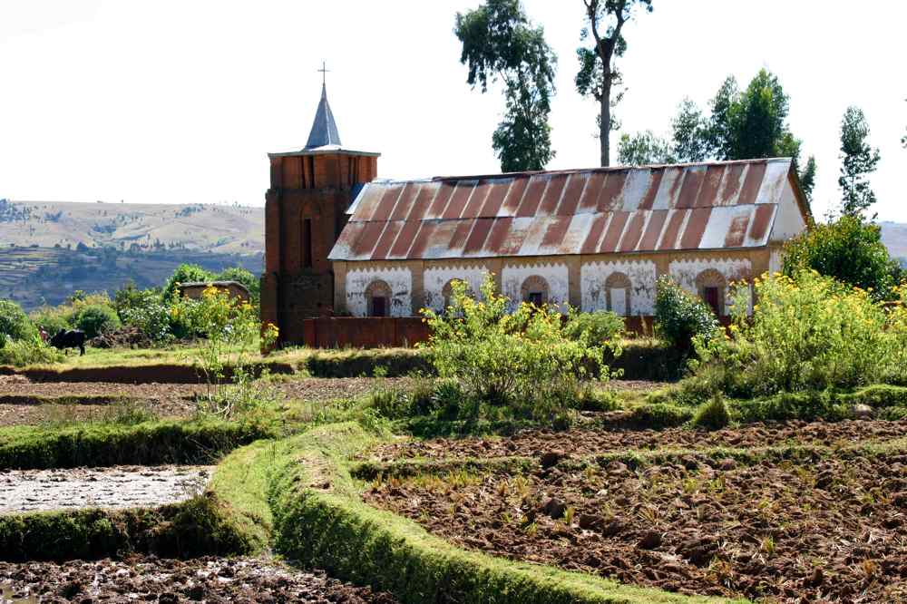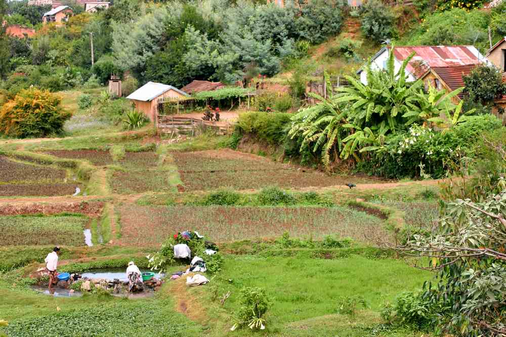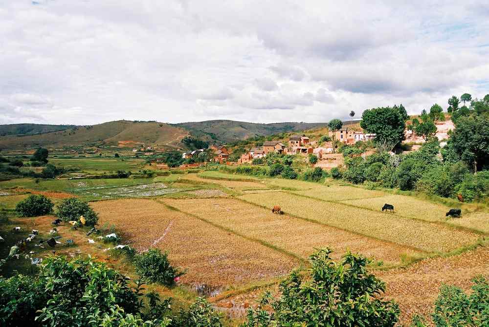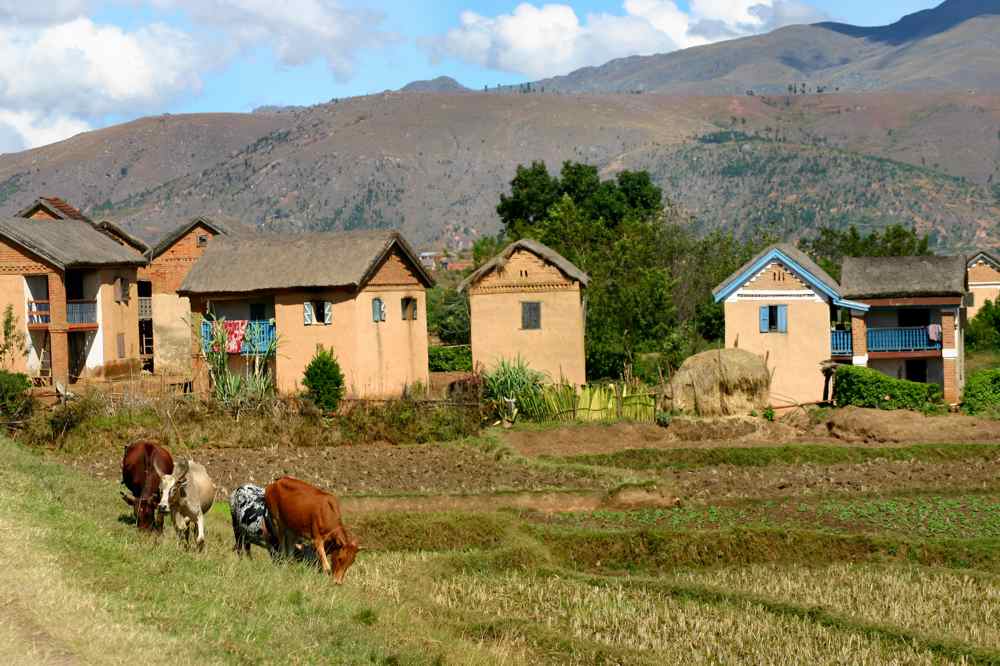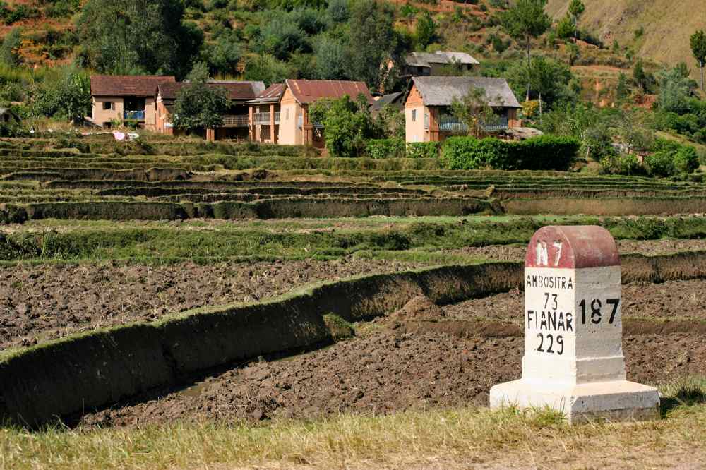 La traversée de Tana sous la bruine n’est pas très amusante dans la circulation anarchique, la chaussée est mouillée et grasse, presque une heure pour s’échapper, puis la RN7 file vers le Sud et nous commençons à goûter au plaisir de rouler en découvrant les paysages des hautes terres, des montagnes pelées laissent place à des résineux ou à des rizières. A la beauté du paysage s’ajoute l’architecture des maisons Betsileo.