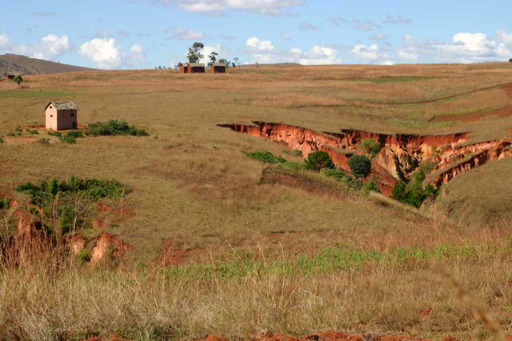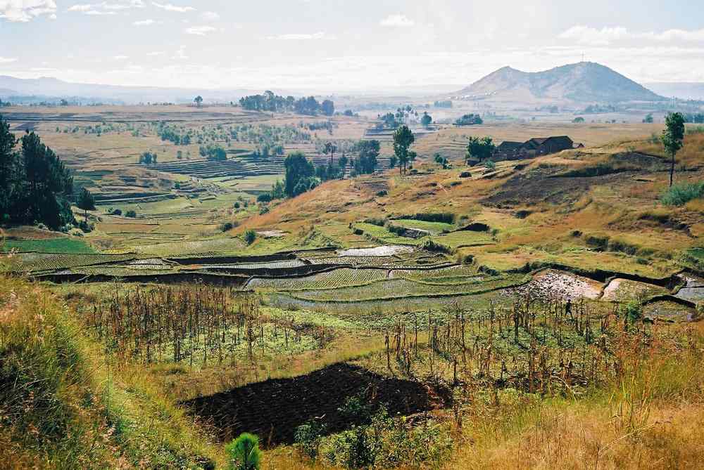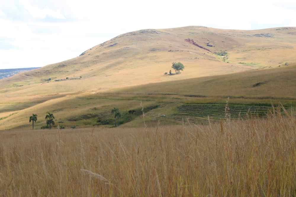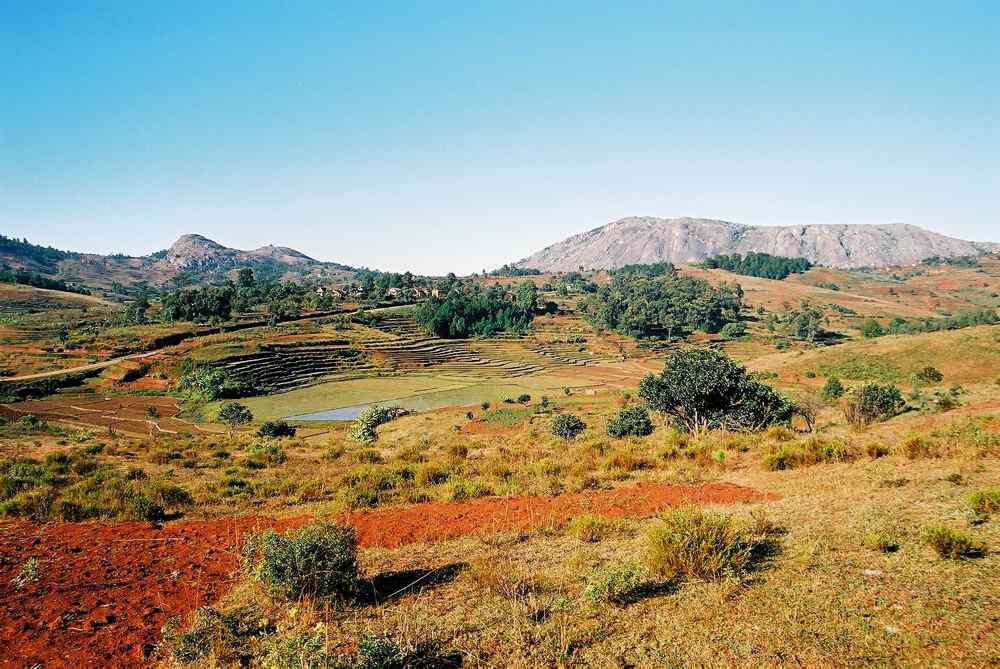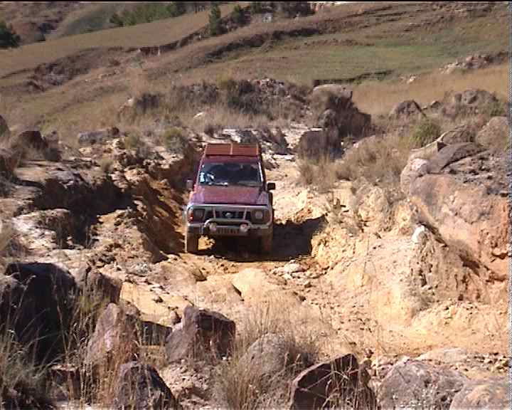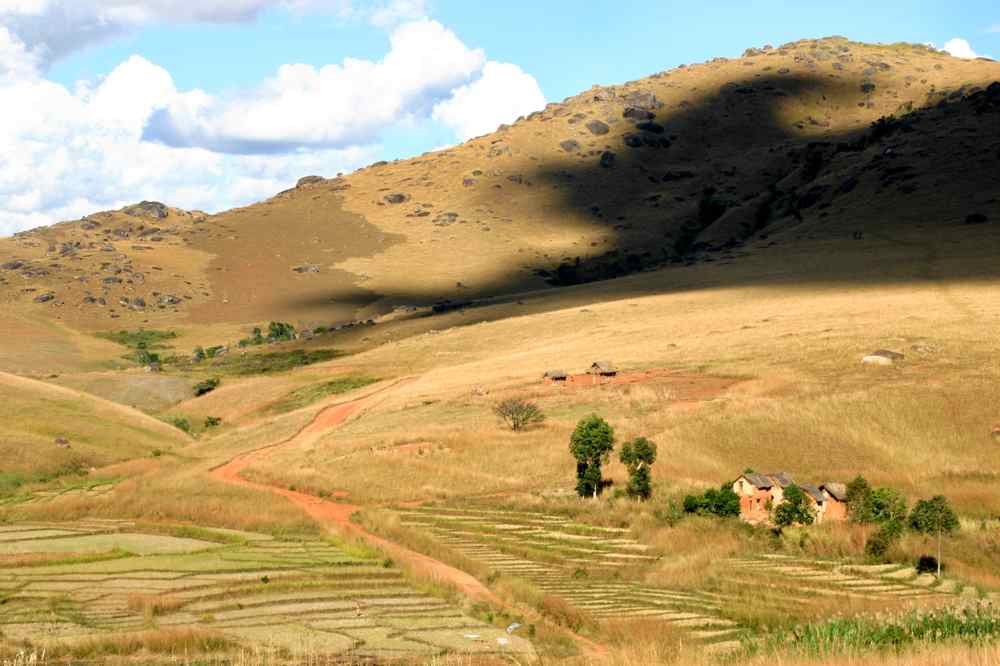Après Ambatofinandrahana, (rajout d’essence) nous ne verrons plus de véhicule jusqu’à demain soir, la mauvaise piste commence, cassante, glissante, caillouteuse, de grosses ornières, une progression lente, nous mettons environs 2 heures pour atteindre les larges plaques de roches du col d’Intremo, nous pensions voir des traces de moto ou de 4x4 mais ce n’est pas évident, les averses ont nettoyé la piste. Nous descendons vers les plateaux herbeux, cela fait 3 heures que nous roulons sans âme qui vive, il y a pourtant quelques cases isolées et des lopins de terre cultivés.