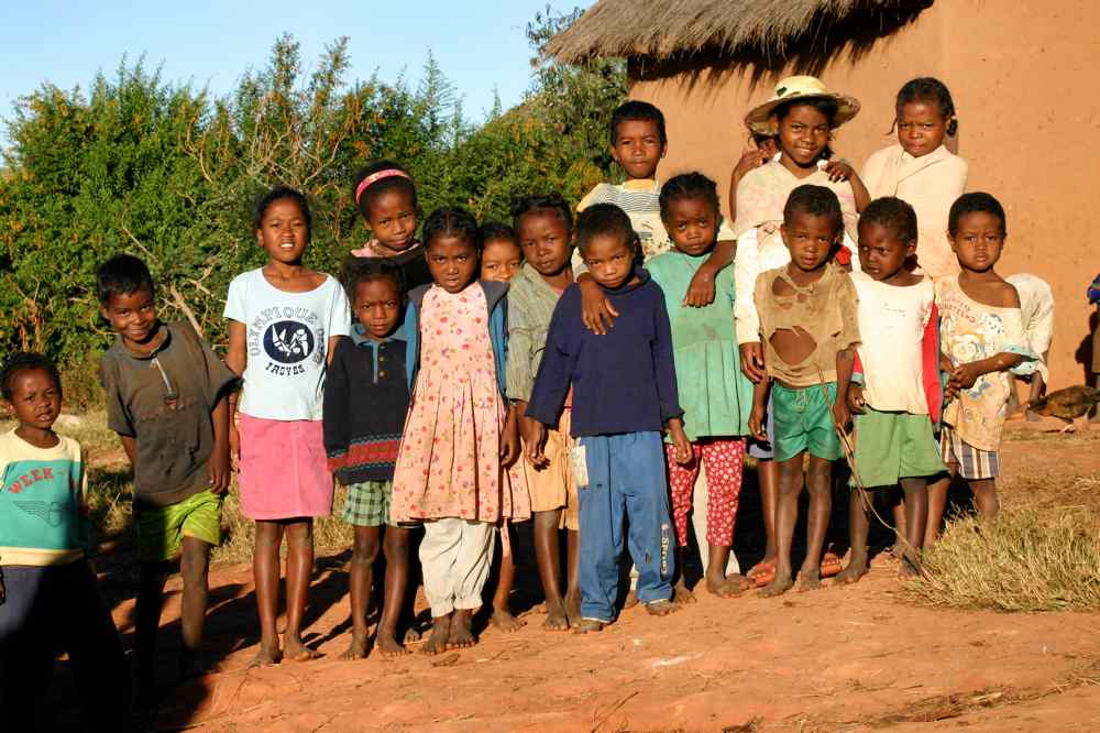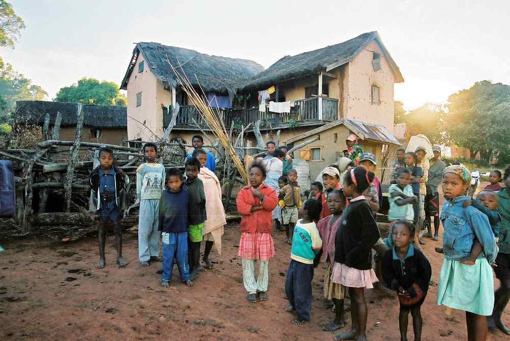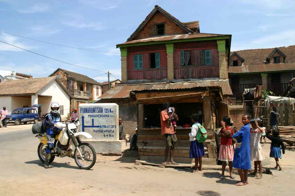 Comme prévu, nous avons juste sommeillé de 4 à 6 , énervés par la concentration de la journée, les aboiements des chiens, les cocoricos en pleine nuit. Je prends mon hôte sur la moto pour qu’il me montre le deuxième gué, reviens au village pour faire une séance photos, faisons nos adieux et quittons le village sous les cris des gamins. Après une bonne suée matinale au passage de 2 gués passé, nous roulons quelques km sur une piste envahie d’hautes herbes qui donne l’impression de conduire des moissonneuses et trouvons la piste principale qui à le nom pompeux de RN35, ça roule mieux qu’hier nous arrivons à Mandrosonoro après une bonne heure, nous avons bien fait de faire la halte hier, je me voyais mal arriver ici de nuit.
