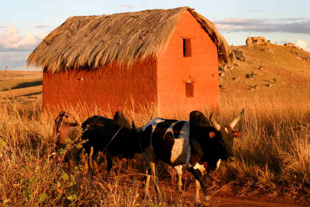 Le soir les zébus rentrent au village, la campagne est inondée de la lumière orangée du soleil couchant.