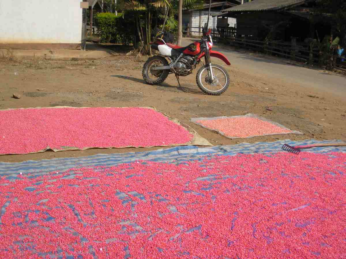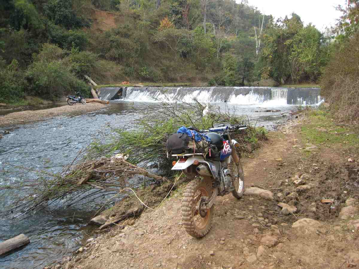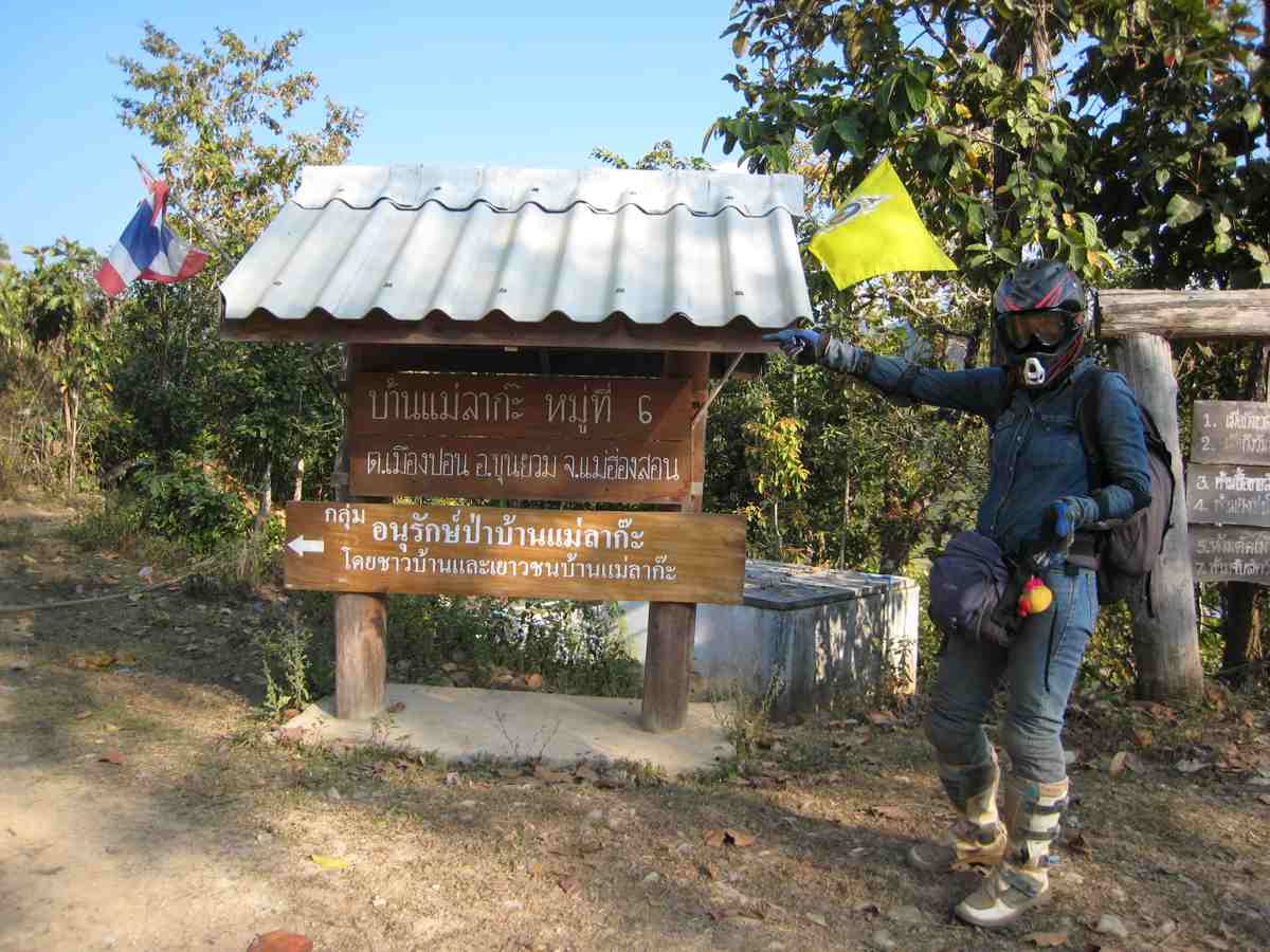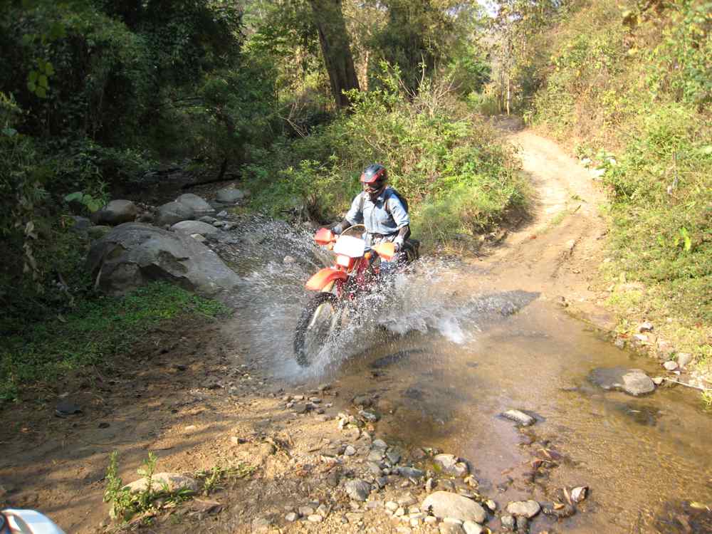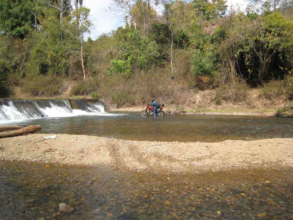 Cathy met mes bottes, elle sera plus à l'aise du 43, par contre dans du 41 pour moi, c'est juste mais çà ira. Nous passons sur le pont de la rivière Mae Chaem pour longer la rive en roulant vers le Nord jusqu’au goudron empruntons la RN 1263 quelques km vers l’Est puis continuons vers le Nord sur des pistes, traversons de beaux villages peuplés de Karens blancs, nous longeons des ruisseaux, une végétation plus luxuriante, mangeons dans un petit restau de village à Mae Sa à 2 euros pour les 3 repas !!!. Reprenons des pistes, traversons une petite rivière, il fait assez chaud et j’improvise une petite baignade rafraîchissante avec moto et bagages, certains diront que je ne l’ai pas fait exprès !!