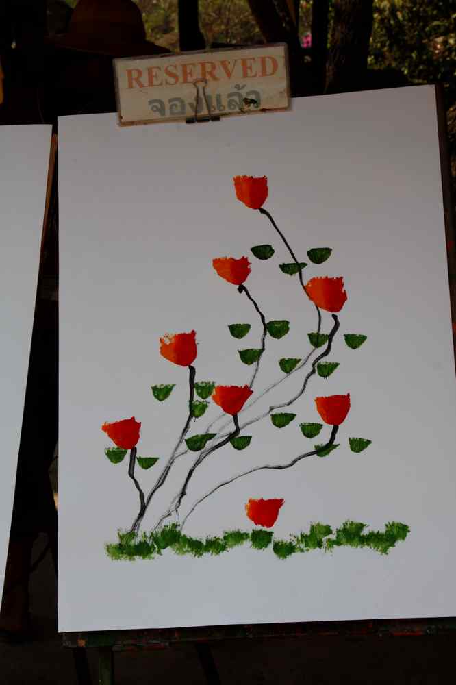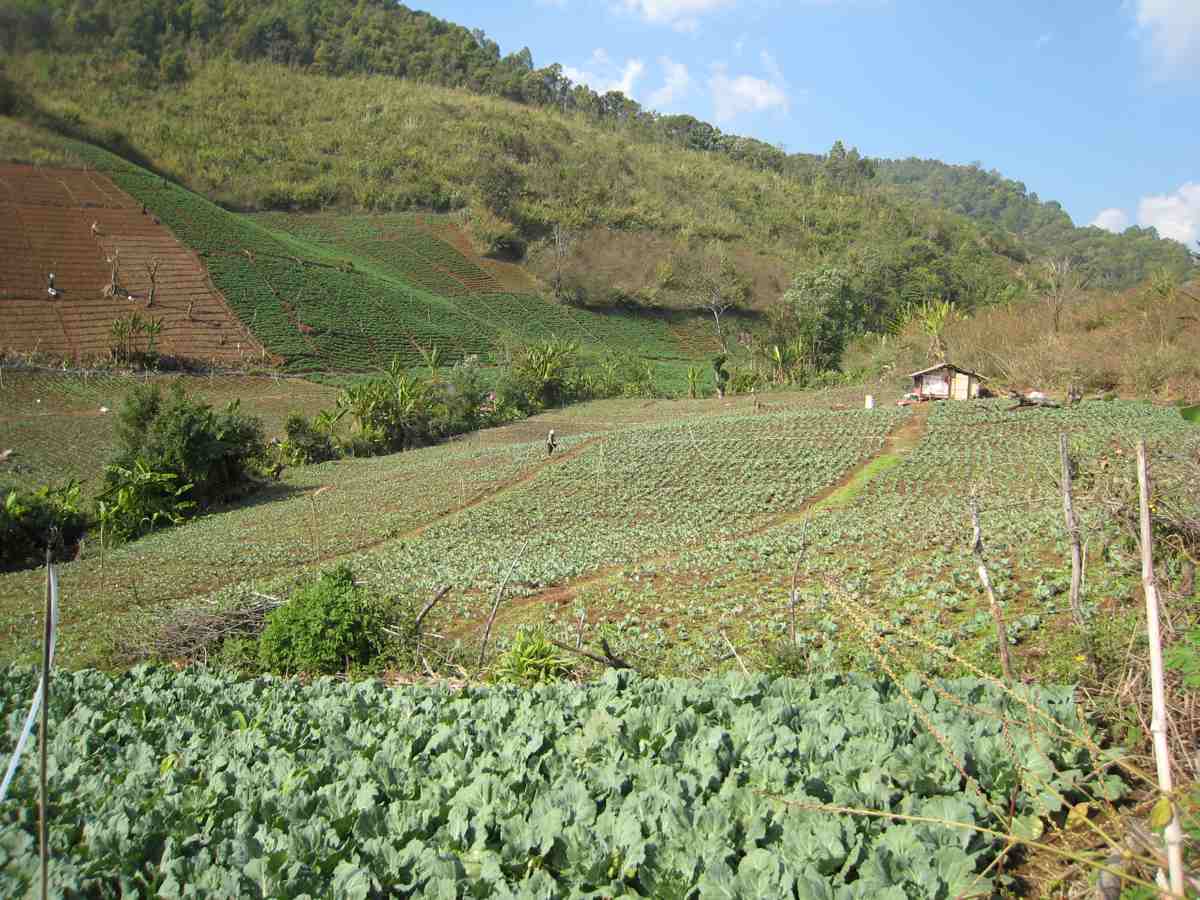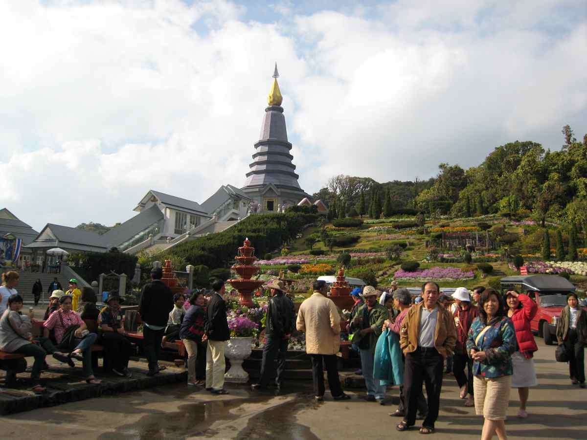 Nous passons par des pistes que j'ai sur ma carte mais que le guide ne connais pas, heureusement qu'il est là pour demander les directions et lire les panneaux en thaïlandais, on est pas très fort en lecture de vermicelles, arrivons jusqu'au point culminant de Thaïlande le Doi Inthanon à 2565m. Le soir vers 17h, arrêt à Mae Cham hôtel , les bungalows confortables sont à 7 euros, génial cela commence bien sauf pour Cathy, les bottes l'ont blessée, grosses ampoules au dessus des talons.