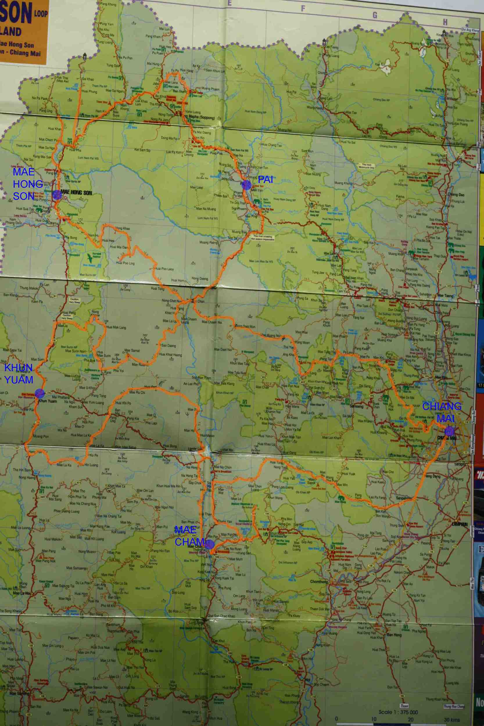 Nous avons trouvé facilement à Chiang Mai quelques cartes de la région éditées par GT riders, j’avais fait une préparation de points GPS en France avec Google Earth sur des cartes achetées en France moins précises au cas où nous ne trouvions pas un guide local motorisé à prix convenable.