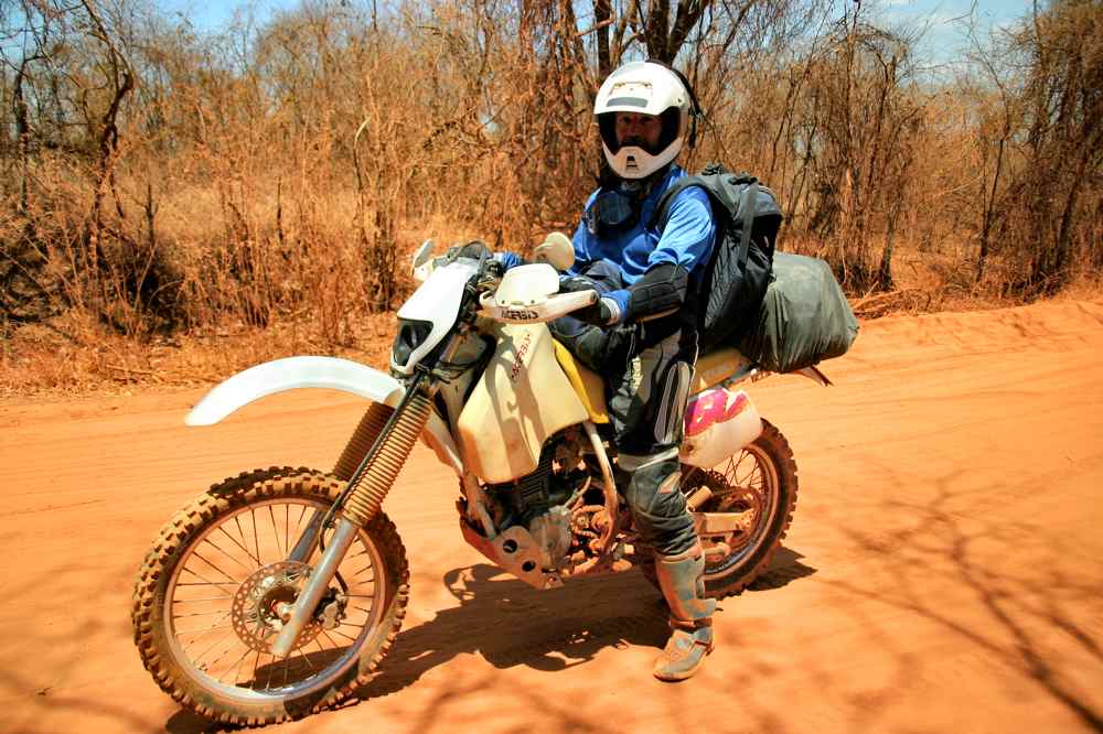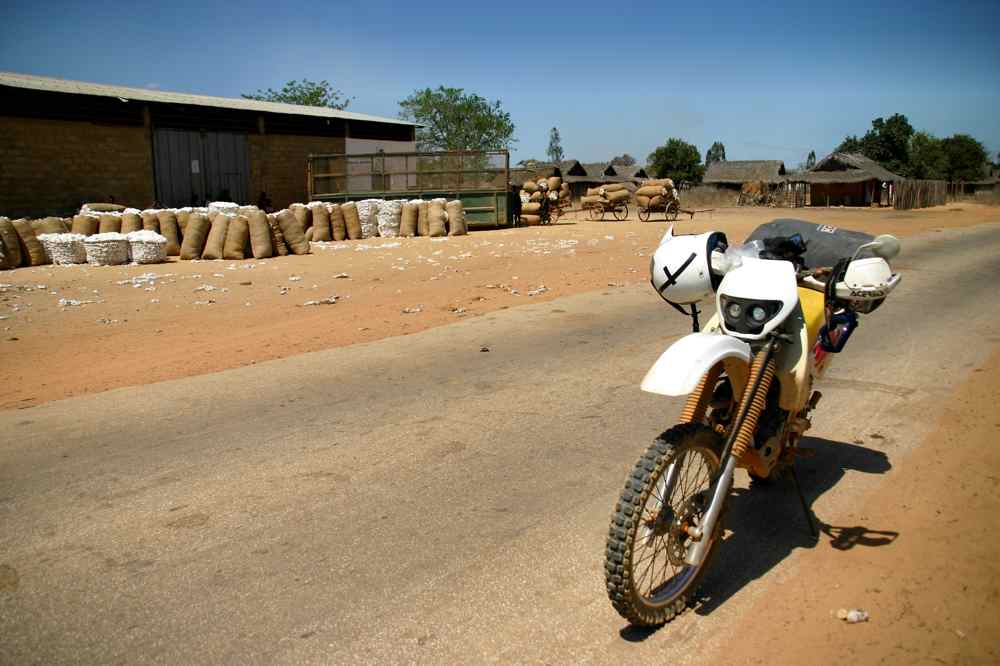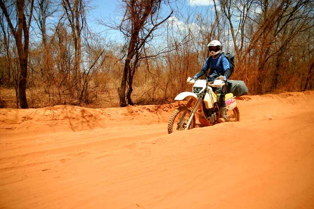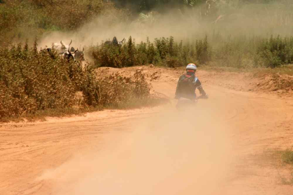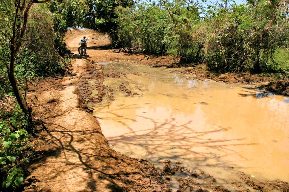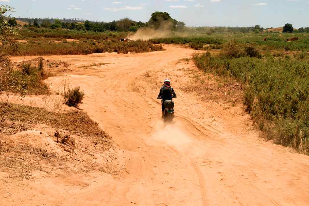 Plus loin, alors que nous roulons à un bon rythme, c’est elle qui chute lourdement, dans un nuage de poussière que j’ai soudainement soulevé elle n’a pas vu l’ornière et s’est plantée pour finir dans le fossé de poussières. Inspection rapide de la conductrice ça a l’air d’aller, la monture a la fourche vrillée. Nous repartons pour trouver un coin à l’ombre, il est 13 heures et un cagnard étouffant, 35 degrés à l’ombre mais il n’y en a pas. Après quelques km, elle s’arrête sous un arbuste et se plaint de sa moto tordue, elle ne se rappelle pas de la chute ni des jours précédents d’ailleurs, un grand moment de solitude à deux, petit à petit je lui remet les compteurs à zéro en remémorant les évènements oubliés à cause du petit traumatisme, une fois la fourche redressée, nous repartons en roulant calmement le paysage devient plus verdoyant, une fin de parcours très agréable après les étendues de campagne calcinée par le feu et le soleil, des grands arbres, quelques cours d’eau, de la forêt. A l’hôtel de Ambanja la mémoire est totalement revenu mis à part le moment de la gamelle. Tout revient en ordre si ce n’est qu’il n’y a plus d’essence au village.