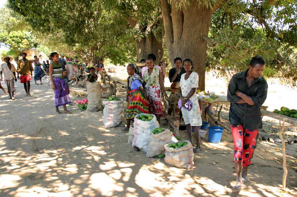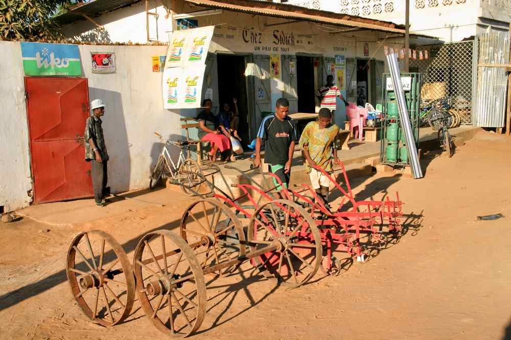 Les croisement avec les rares véhicules sont épiques, les camions ne doivent pas ralentir sous peine de rester coincés avec du fechfech jusqu’aux essieux, nous en voyons plusieurs ainsi sur une piste parallèle. Pour les dépassements c’est plus facile car nous pouvons choisir le meilleur endroit. Heureusement qu’il ne pleut pas, la piste doit être cauchemardesque ou infranchissable transformée en gadoue de poussière. Finalement , nous arrivons à Port-Bergé (Boriziny) en début d’après midi et décidons d’en faire une étape, l’hôtel est sympathique, bien sûr la chambre est un peu plus chère qu’hier mais nous pourrons dormir. Le village s‘avère calme et assez ombragé, nous prenons le temps de déambuler, faire du lèche vitrine (si on peut dire) et passer un moment avec les familles occupées à leur travail.