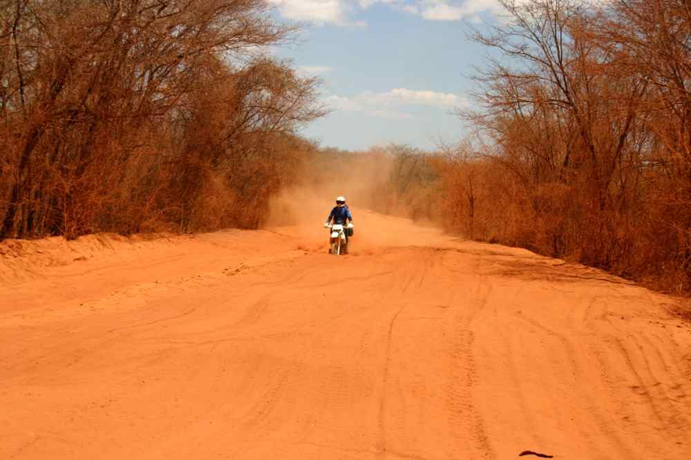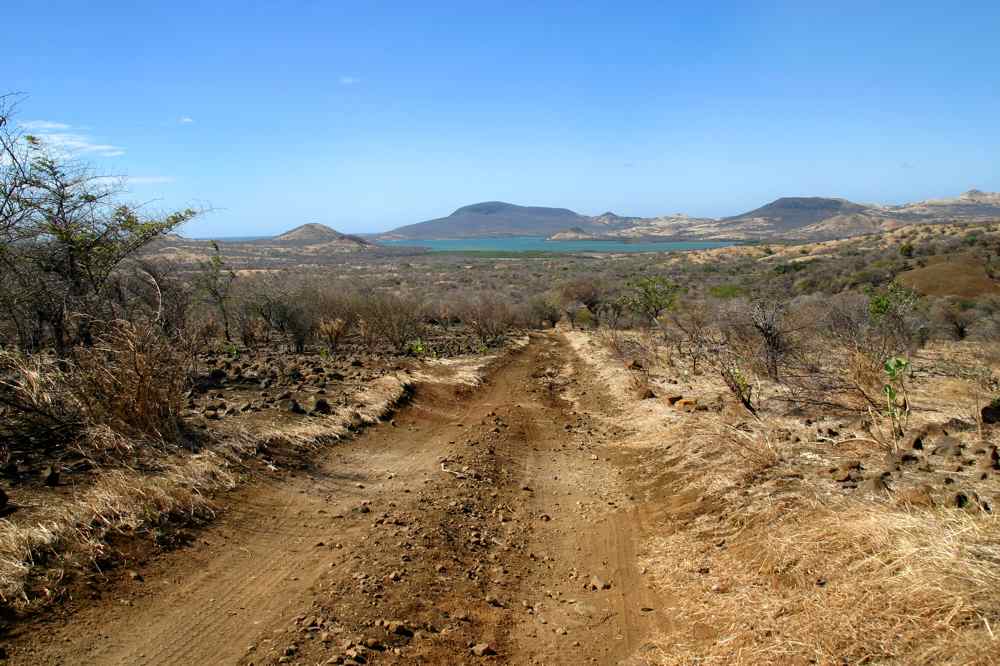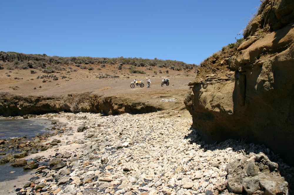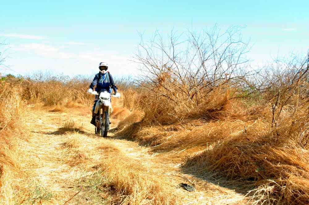 Nous partons tôt, sans bagages juste avec un casse-crôute, de l’eau et des outils, à Diégo nous récupérons Nanard et son 400XR pour commencer la ballade vers le nord. Nous sommes vite déçus par la végétation, de longues herbes jaunes couchées par le chaud vent d’est, des épineux, heureusement il y a aussi quelques sous-bois pour rouler à l’ombre. En remontant la côte Est, nous avons de beaux points de vue sur la grande baie en forme de trèfle quatre-feuilles. Les chemins sont caillouteux, cassants, et piégeux, surtout lorsqu’ils sont recouverts de cette herbe jaune, un coup de gaz mal dosé et c’est la chute, j’en ai fait l’expérience, sans les bagages on se sent des ailes.