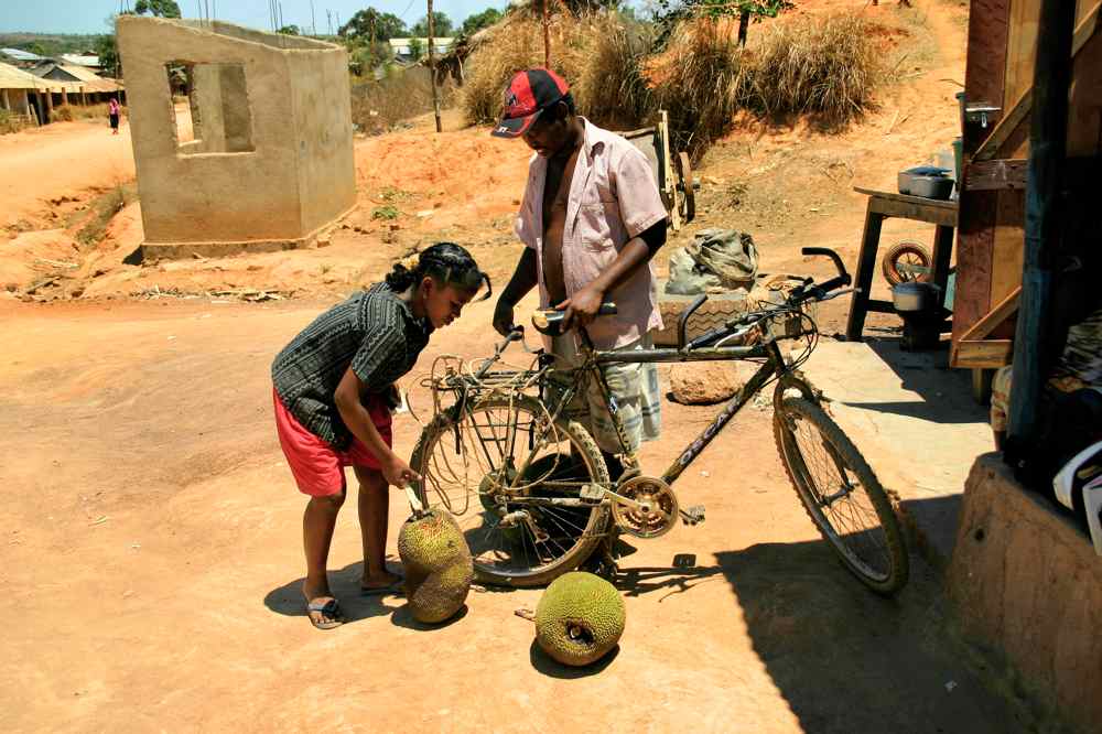 Heureusement il y a des manguiers qui offrent une ombre hospitalière pendant nos poses rafraîchissantes et nous sauver de la chaleur écrasante. Enfin nous trouvons une case d’information de l’Ankarana, le bureau est vide, d’ailleurs on se demande bien qui pourrait venir jusqu’ici, par manque d’info et la difficulté de communiquer avec les personnes rencontrées nous décidons d’arrêter les frais, de rebrousser chemin jusqu’à Anivorano pour retrouver le goudron.