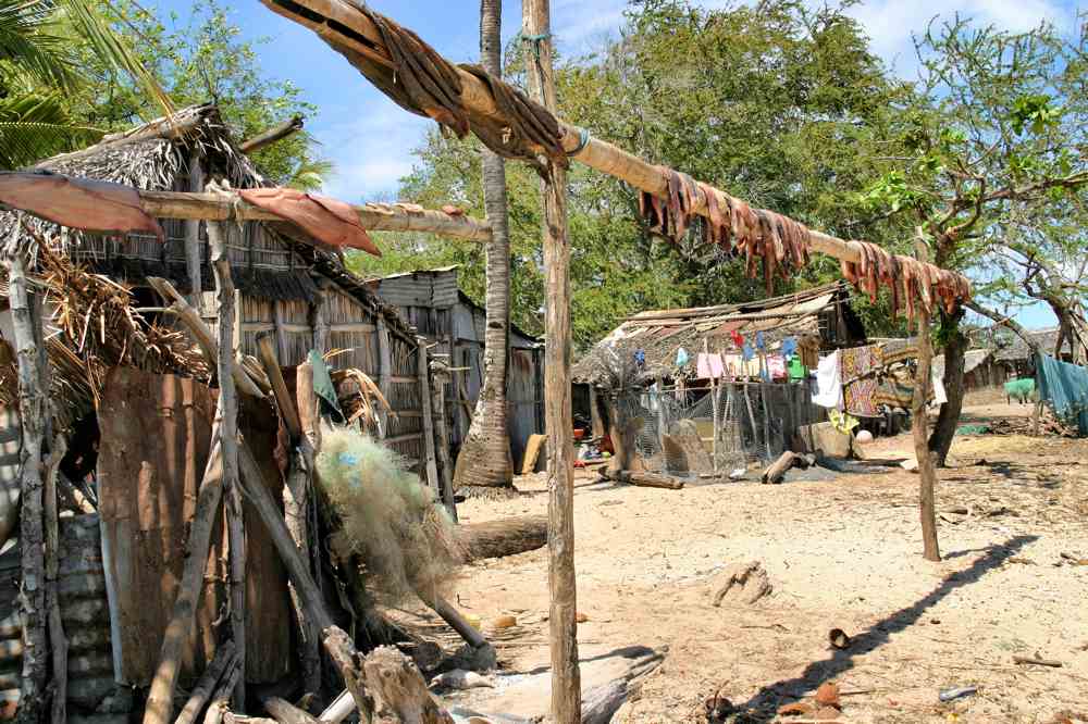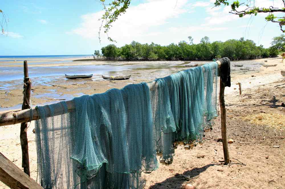 Une baie au sud de Raména, les filets sèchent pendant que les pêcheurs se reposent
