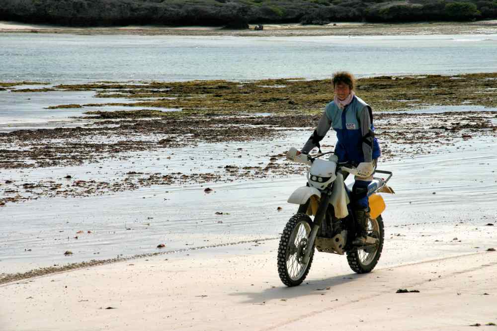Une motarde à la plage, les traces de roues s’effaceront naturellement