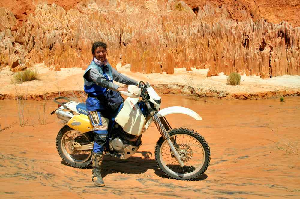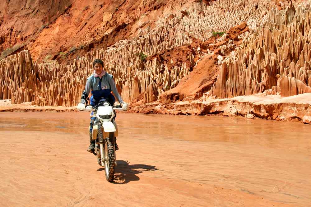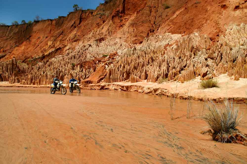 Nous retrouvons un petit bout de goudron de la RN6,puis vers la borne 45, nous suivons une piste qui mène au tsingys rouges que nous surplombons puis descendons dans le canyon. Nous roulons dans le lit de la rivière sur une surface de sable plat et dur dans quelques centimètres d’eau que les roues projettent, un pur moment de plaisir de conduite, une adhérence incroyable, le tout dans une belle végétation qui abrite de petits troupeaux de zébus un peu apeurés par notre arrivée. Nous arrivons rapidement au fond du canyon où sont les fameux tsingys colorés, formation due à l’érosion par l’eau de cette terre fragile qu’elle arrache aux falaises. Nous pique-niquons à l’ombre, je me refait un aller retour dans le canyon pour le régal et filmer avec la caméra fixée au casque.