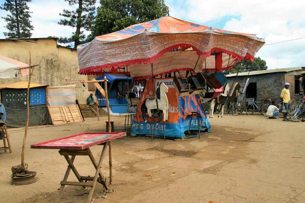 Petite foire foraine à Anivorano Ava, table de loterie, certains manèges sont actionnés à la manivelle, publicité gratuite pour les magasins Leclerc, la bâche a dû être récupérée sur un poids lourd