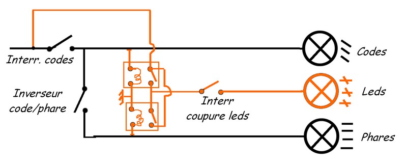 En fait je cherche le cablage qui me permettrait de les brancher en continu sur les codes et qu'ils puissent s'allumer en phare s'ils sont éteint en code (la nuit, les leds eblouissent)
