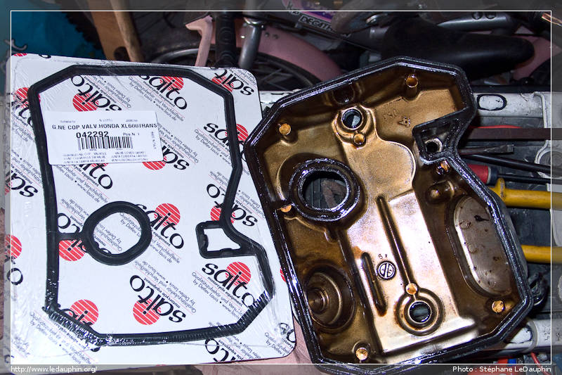 Le joint du couvre culasse du cylindre arrière n'étant plus étanche, j'ai donc acheté un tout neuf, c'est pas (trop) cher. Évidement, les bureaux d'étude Hondesque ont embauché des gynécologues, ce qui fait que pour sortir le couvre culasse arrière c'est un peu sport, faut virer les bobines, la traverse du cadre, la boite à air ... et ça veut pas.
