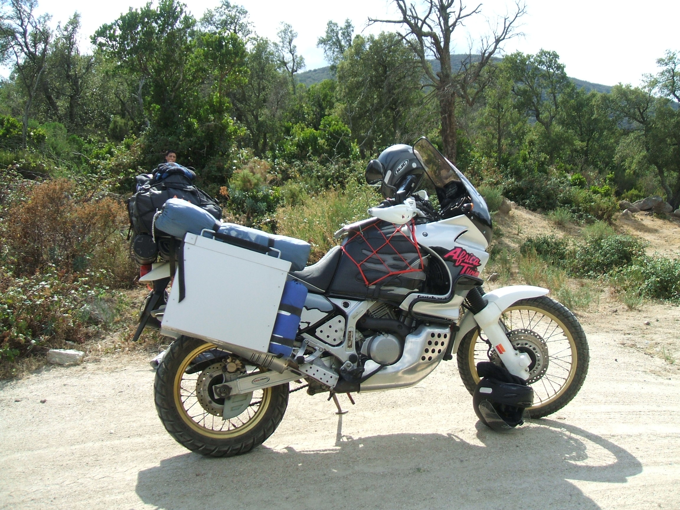 Ma compagne d'aventure est une vénéreble Africa Twin rd07 de 95,que je bichonnes et améliores sous les conseils d'Atocien éclairés;