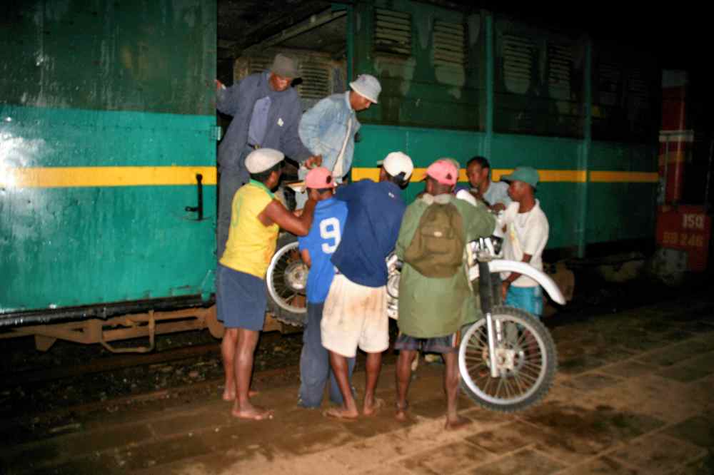 Un peu de mécanique en guise de petit déjeuner, la cause est une vis foirée!! (réparation provisoire). Départ tardif RN7, il y a une piste à l’ouest nous laissons, pas le temps, nous avons un train à prendre ! si, si ! Arrivés à Fiana dans l’après-midi nous chargeons les motos dans un wagon marchandise après avoir vidé les réservoirs