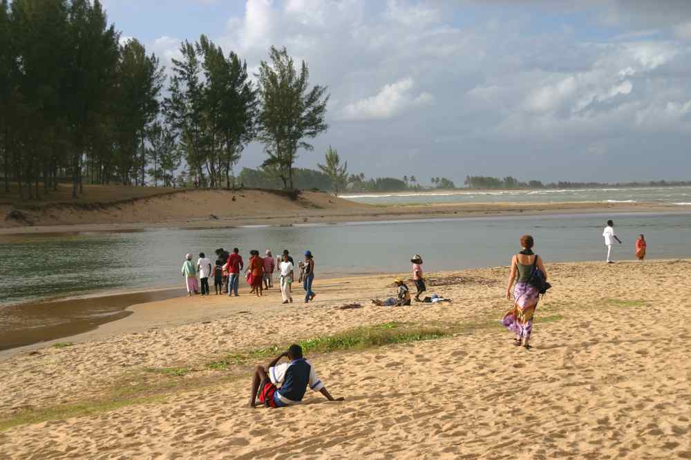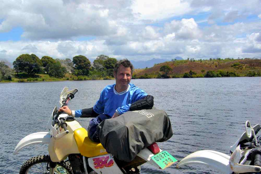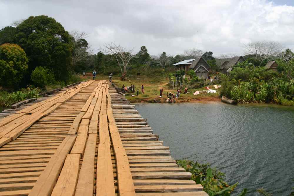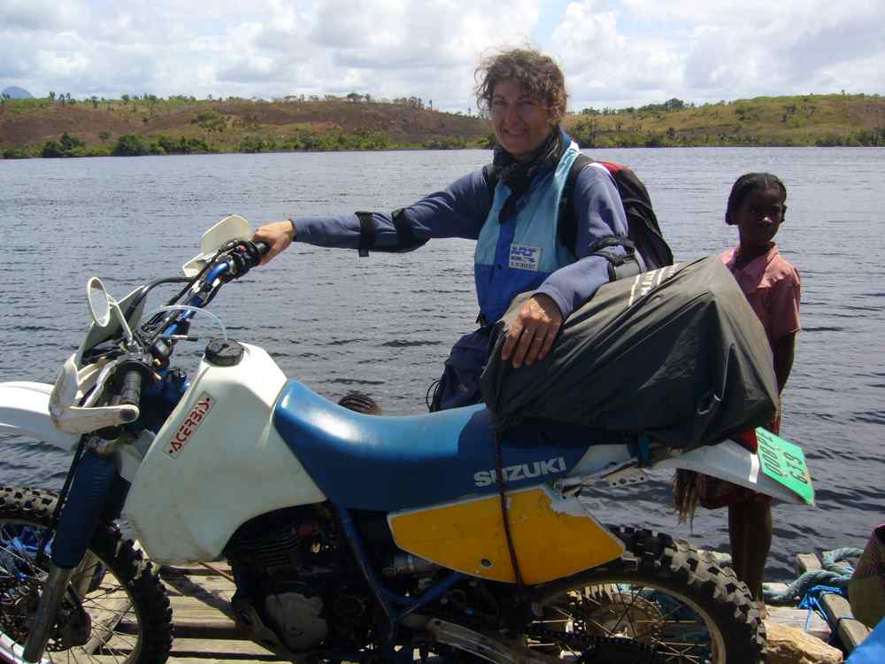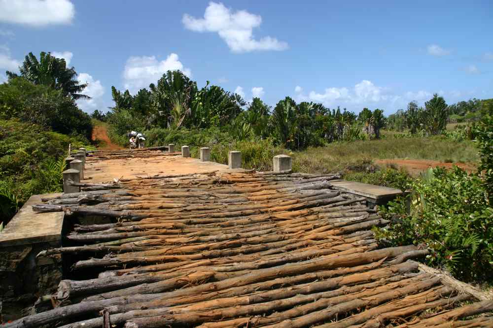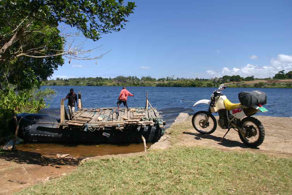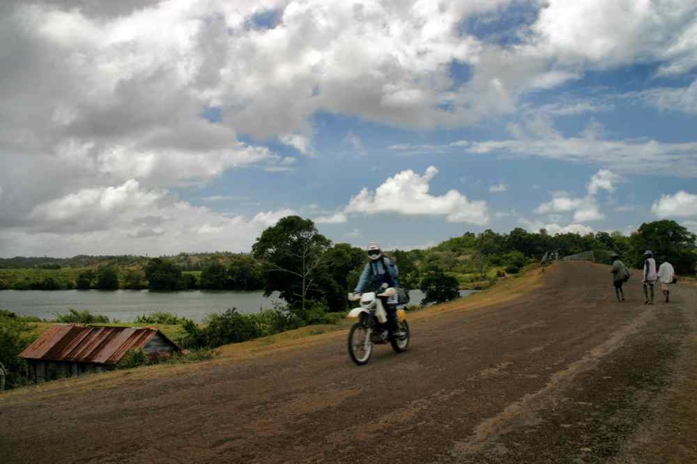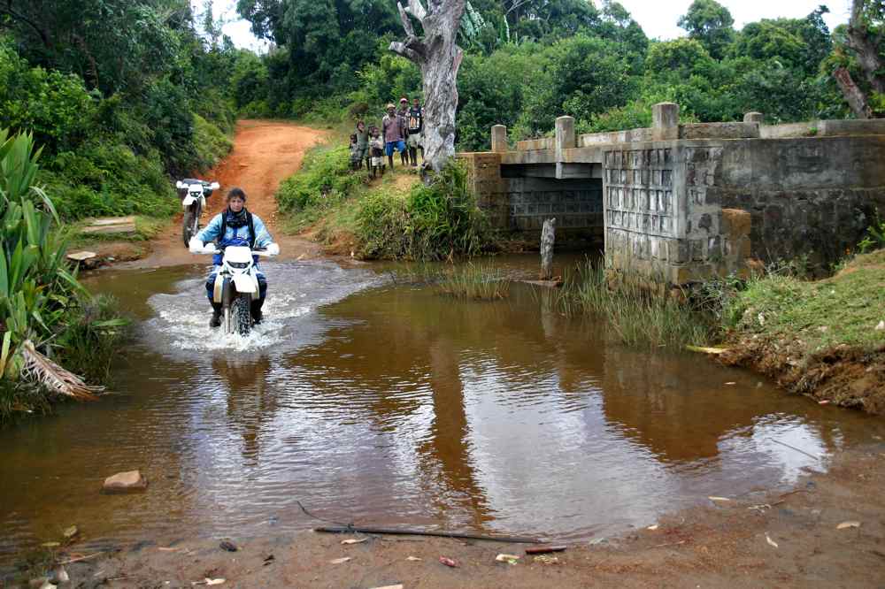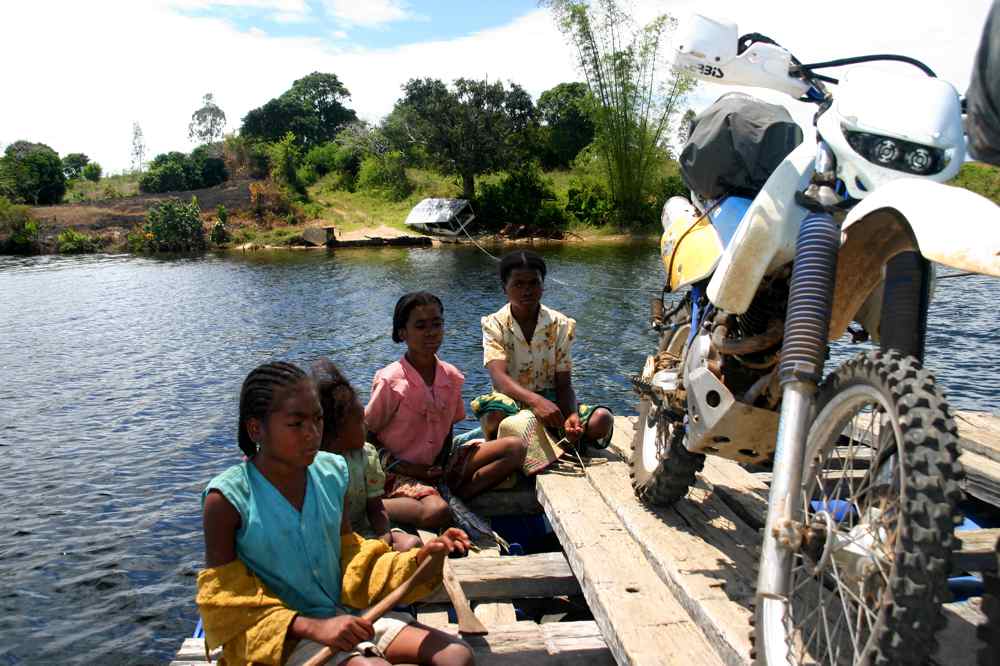 RN12 enfin, la vrai piste commence, les surprises aussi, quelques orages, ponts cassés passages sur des poutres ou à gué (depuis que j’ai noyé 2 motos en 2004, en cas de petit doute, je fais une reconnaissance et passe mes journées les pieds baignant dans les bottes, çà va il fait chaud) çà va durer 250km. Le premier bac est en réparation (il y en a 9 avant Fort Dauphin) donc traversée en pirogues sans souci après avoir attendu la fin d’une averse. On se paume un peu, la piste la plus empruntée n’est pas forcément la bonne, passages de gués, un peu de sable. Nous longeons l’océan sans le voir, de temps en temps, nous prenons des sentiers à gauche et stoppons sur des plages du bout du monde, au côté sauvage des lieux, s’ajoute celui la mer démontée . Puis stoppons à Sandravinany ,en évitant de nous lancer dans une difficulté l’après-midi et profitons de passer un moment avec les villageois, qui libèrent une case pour nous héberger. Nous faisons des étapes courtes pour éviter la fatigue, réduire les galères, favoriser le contact et prendre du temps pour les photos. Baignade agréable dans la rivière tentante en espérant ne pas chopper de saletés mais il n’y a pas d’eau à la case pour se décrasser.