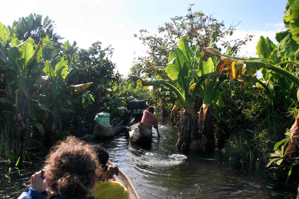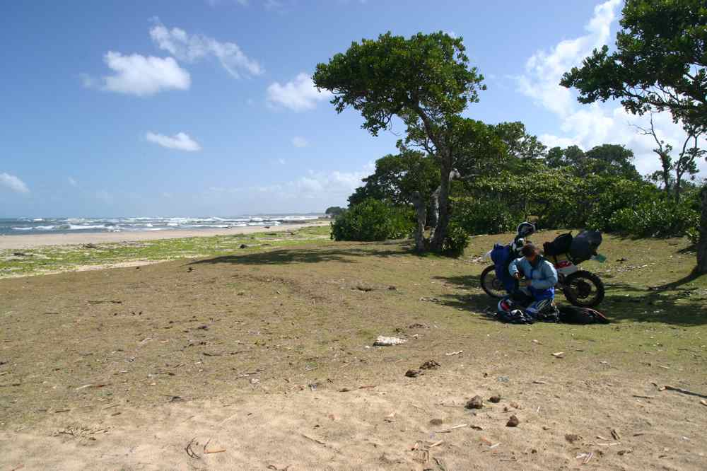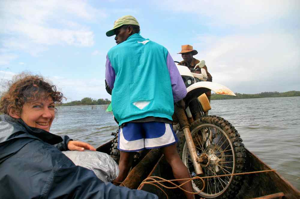 D’après les habitants, le bac ne fonctionne pas et la RN est impraticable sur plusieurs km (difficile de bien comprendre, nous maîtrisons moins le malgache qu’eux le français) Tous sont unanimes, il faut longer l’océan un certain temps puis retrouver la RN12 en visant le sud ouest, sur la carte la piste est ouverte de juin à octobre, d’autres pistes du pays ne sont praticables en principe que 2 mois dans l’année en saison sèche, le problème de mada c’est l’eau, trop ou pas assez, facile de rester bloqués quelques jours entre deux rivières sans échappatoire. Les pêcheurs nous proposent la traversée en pirogues plutôt galère mais tant que l’histoire ne tombe pas à l’eau….Ces piroguiers ne sont pas habitués à arrimer les motos, nous rajoutons des sangles et montons sur une autre pirogue par crainte de finir au fond, nous avons compris qu’il faudrait prendre des vagues, en fait, après une longue et tranquille traversée en partie dans la mangrove, nous accostons étonnés et satisfaits sur la rive sud. Là nous trouvons, des sentiers, des chemins, du hors piste en bord de mer puis des traces de camion nous suivons nos points gps mais à une dizaine de km plus à l’est et un peu au pif, au bout du fameux certain temps, nous décidons de faire cap vers la RN12 le cap est difficile à tenir à cause de marigots dans les creux qu’il faut éviter, les traces sont de plus en plus nombreuses nous croisons, suivons les pistes qui nous inspirent puis presque sans nous en apercevoir tombons sur un waypoint de la RN. Encore 2 bacs et nous sommes à Manantenina, il est encore tôt mais pas le temps de passer les 5 bacs suivants, nous faisons halte pour profiter du coin, dégustons un ‘’poulet bicyclette’’ et trouvons un joli coin au bord de l’océan.