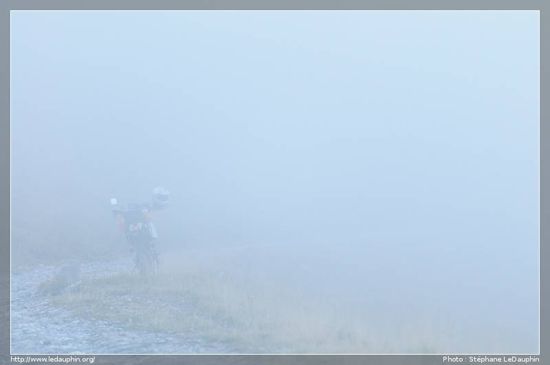 Heureusement que le vent déchire régulièrement la couche de nuages, mais hélas pas forcement lors des passages des motos. Le temps passe, l'équipe 19 n'est toujours pas passée, Didier et Oligo idem, mais impossible de les contacter, il n'y pas de réseau GSM dispo (et oui, grande première, j'avais un téléphone !).