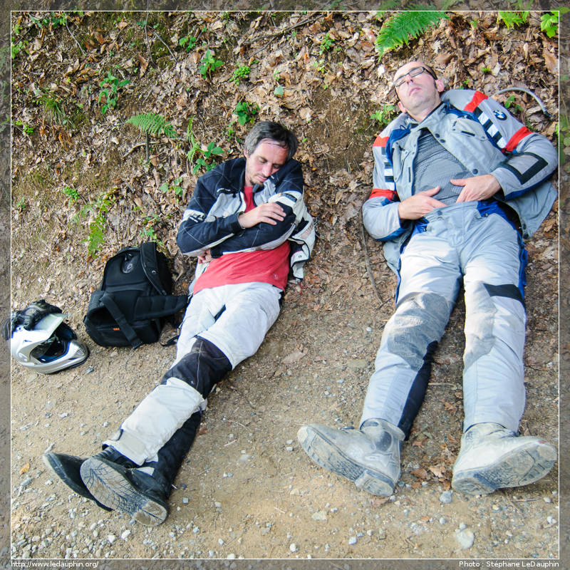 Dans une épingle à droite, ma roue avant ripe sur une pierre et je n’insiste pas pour retenir la moto, on me la ramasse (comme d’hab’), tout va bien et je continue