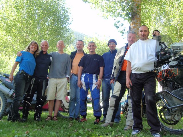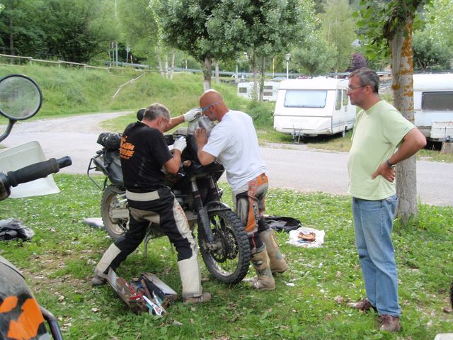 Le Titi, il est tout abîmé et on voit que les motos ont souffert aussi. Mais ça fait du bien de retrouver des gens super sympas que nous avions vu à la Stella en juillet 2007. Pendant que nous passons une bonne soirée au resto du camping, Titi va faire des radios à l’hôpital d’Andorre, il revient pour nous annoncer une bonne luxation de la clavicule…ses vacances sont finies, il sera rapatrié plus tard.