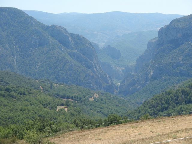 Après avoir contourné le lac du Salagou près de Clermont-L’Hérault, nous prenons des petites routes sinueuses, un petit café à l’abbaye de FontFroide, admirons les Gorges de Galamus, passons dans celles de l’Aude pour aller planter notre tente au très chouette camping de Err près de Saillagouse en fin d’après-midi. Même en traînant sérieusement, nous serons largement en avance sur notre RDV à Andorre, faire du shopping dans un endroit surpeuplé de personnes atteintes de fièvre acheteuse n’est vraiment pas notre truc. Nous repérons une piscine thermale à Llo à 6kms de notre camping. Des bains d’eaux chaudes bouillonnantes sulfureuses nous accueillent pendant 2h et tout notre stress + fatigue liés au boulot sont noyés illico-presto.