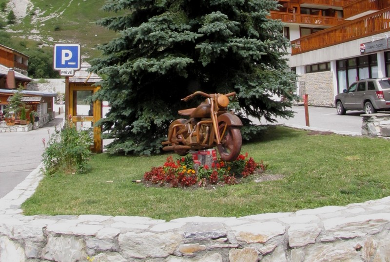 Sur la redescente en direction de Val d’Isère, la route est aussi superbe, moins jolie à mon gout mais tout aussi respectable pour les yeux. Puis, à Val d’Isère nous décidons de nous poser pour boire un bon chocolat chaud. Nous nous arrêtons devant un hôtel qui a la particularité de présenter à l’entrée de son parking, une très belle sculpture d’Harley Davidson, en bois !
