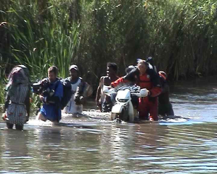 Nous roulons bien pendant une cinquantaine de km, lorsque j’entends des bruits bizarres de frottement dans les creux, le diagnostic est sans appel, j’ai perdu 2 vis du coté gauche du porte-bagages, tout le poids c’est reporté sur la droite, la boucle du cadre a cassé, pas moyen de bien consolider, il faut souder !!! Je rafistole avec du fil de fer et nous chargeons tous les bagages sur la moto de Cathy, il ne lui reste pas trop de place, nous rattrapons Eric qui attend. Les 2 motards réunionnais d’hier nous rattrapent et roulent avec nous. Nous traversons le long marigot d’eau crade en poussant les motos, il ne vaut mieux pas penser aux saletés qui ne manquent pas dans ces eaux noires, certains sont passés en roulant, puis séance de séchage de filtre à air et de kickage, seules le 400 d’Eric et le 350 de Cathy ont bien démarré, le 400XR, plus haut passe mieux que le 350DR dans l’eau.