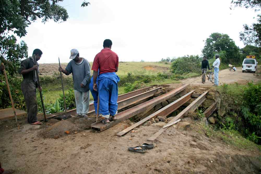 Départ tardif RN7 rythme tranquille, segmentation neuve, nous traversons les paysages des hautes terres, rizières, forêts. Pas le temps de prendre la piste parallèle à l’est empruntée en 2005, il ne faut pas trop forcer ni traîner. A la nuit tombante, nous forçons le rythme, grosse fuite d’huile. Par précaution, nous roulons les 20 derniers km en se tractant avec une sangle.