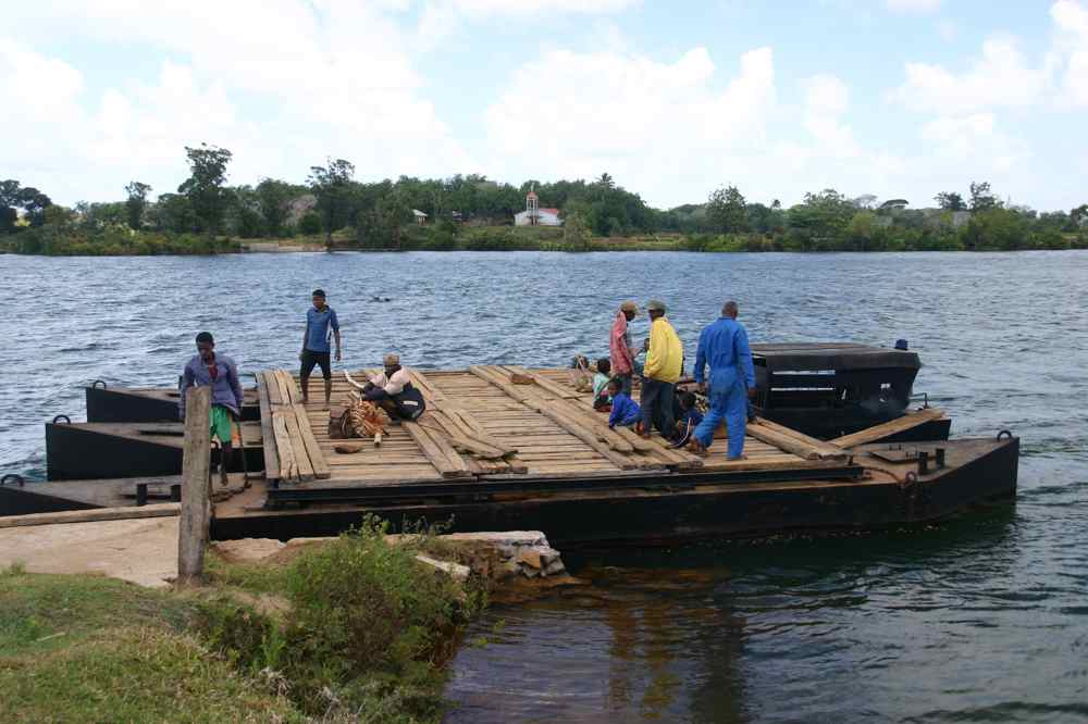 voilà à quoi ressemble un bac à moteur en bon état,c'est un service public,il faut parfois attendre pour traverser,l'autre option est de nager comme les 2 zébus dont le propriétaire préfère rester au sec