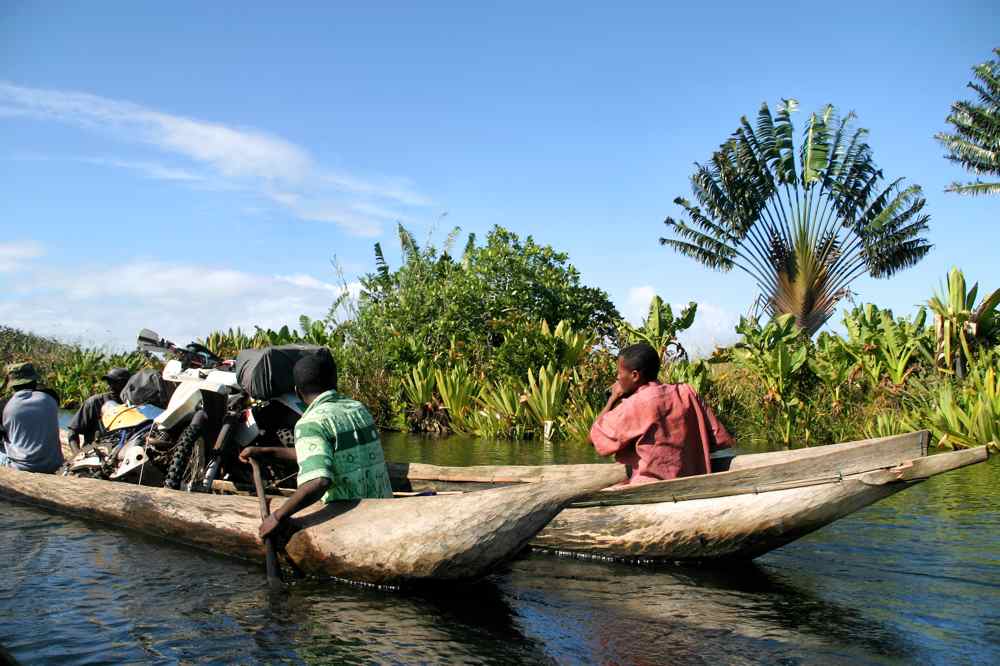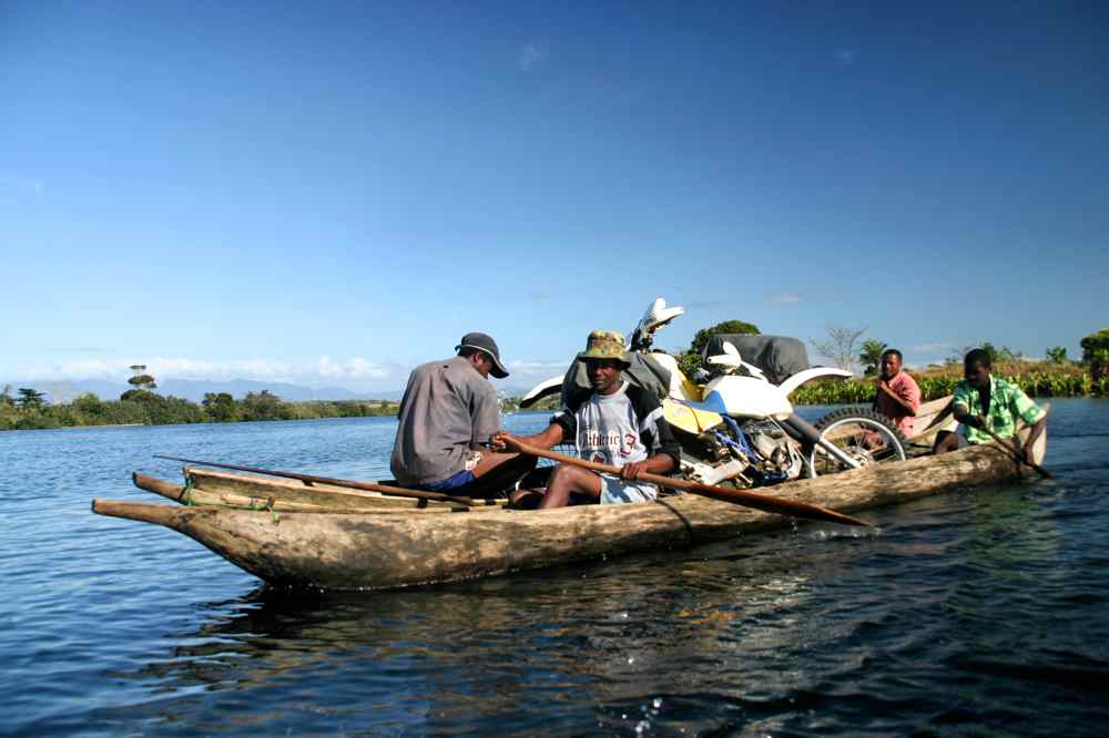 D’après les habitants, le bac ne fonctionne pas et la RN est impraticable sur plusieurs km (difficile de bien comprendre, nous maîtrisons moins le malgache qu’eux le français) Tous sont unanimes, il faut longer l’océan un certain temps puis retrouver la RN12 en visant le sud ouest, sur la carte la piste est ouverte de juin à octobre, d’autres pistes du pays ne sont praticables en principe que 2 mois dans l’année en saison sèche, le problème de mada c’est l’eau, trop ou pas assez, facile de rester bloqués quelques jours entre deux rivières sans échappatoire. Les pêcheurs nous proposent la traversée en pirogues plutôt galère mais tant que l’histoire ne tombe pas à l’eau….Ces piroguiers ne sont pas habitués à arrimer les motos, nous rajoutons des sangles et montons sur une autre pirogue par crainte de finir au fond, nous avons compris qu’il faudrait prendre des vagues, en fait, après une longue et tranquille traversée en partie dans la mangrove, nous accostons étonnés et satisfaits sur la rive sud. Là nous trouvons, des sentiers, des chemins, du hors piste en bord de mer puis des traces de camion nous suivons nos points gps mais à une dizaine de km plus à l’est et un peu au pif, au bout du fameux certain temps, nous décidons de faire cap vers la RN12 le cap est difficile à tenir à cause de marigots dans les creux qu’il faut éviter, les traces sont de plus en plus nombreuses nous croisons, suivons les pistes qui nous inspirent puis presque sans nous en apercevoir tombons sur un waypoint de la RN. Encore 2 bacs et nous sommes à Manantenina, il est encore tôt mais pas le temps de passer les 5 bacs suivants, nous faisons halte pour profiter du coin, dégustons un ‘’poulet bicyclette’’ et trouvons un joli coin au bord de l’océan.