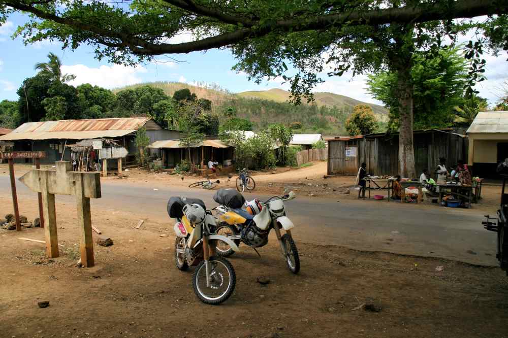 Plus loin, alors que nous roulons à un bon rythme, c’est elle qui chute lourdement, dans un nuage de poussière que j’ai soudainement soulevé elle n’a pas vu l’ornière et s’est plantée pour finir dans le fossé de poussières. Inspection rapide de la conductrice ça a l’air d’aller, la monture a la fourche vrillée. Nous repartons pour trouver un coin à l’ombre, il est 13 heures et un cagnard étouffant, 35 degrés à l’ombre mais il n’y en a pas. Après quelques km, elle s’arrête sous un arbuste et se plaint de sa moto tordue, elle ne se rappelle pas de la chute ni des jours précédents d’ailleurs, un grand moment de solitude à deux, petit à petit je lui remet les compteurs à zéro en remémorant les évènements oubliés à cause du petit traumatisme, une fois la fourche redressée, nous repartons en roulant calmement le paysage devient plus verdoyant, une fin de parcours très agréable après les étendues de campagne calcinée par le feu et le soleil, des grands arbres, quelques cours d’eau, de la forêt. A l’hôtel de Ambanja la mémoire est totalement revenu mis à part le moment de la gamelle. Tout revient en ordre si ce n’est qu’il n’y a plus d’essence au village.