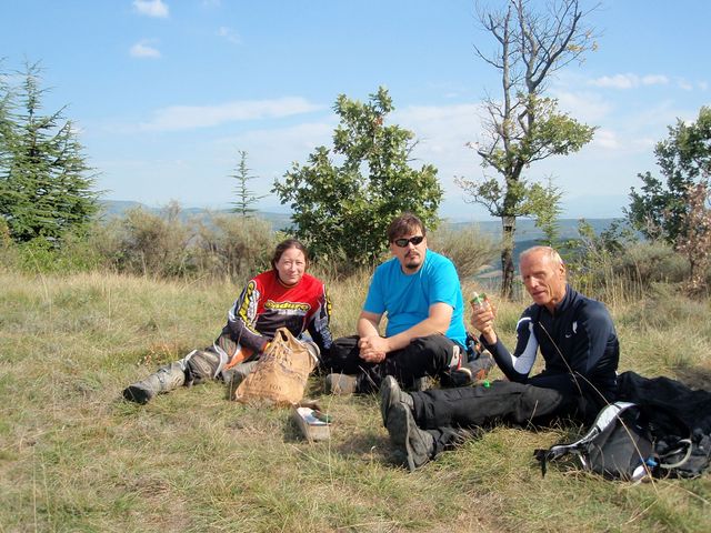 Une grosse grimpette sur de la terre bien fraîche qui se termine par une voie recouverte de grosses pierres entre deux murets A force de jardiner dans tous les sens, nous finissons par arriver sur une piste large qui nous mène sur la crête Nous filons vers le sud, direction Balazuc où nous ferons une pause pique-nique bien méritée