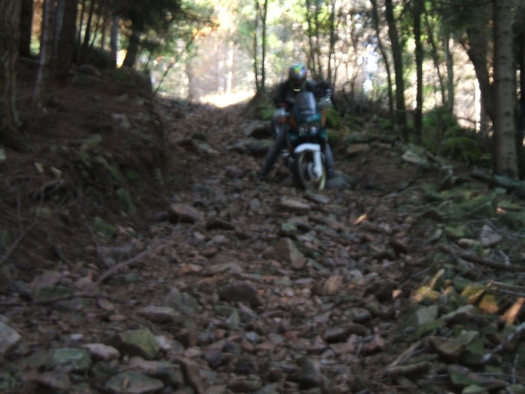 J'ai fait toute la descente en première, mais c'était très raide, j'ai pris de la vitesse et il n'y avait que de la petite caillasse qui roulait sous les roues, fallait éviter de freiner pour pas se planter , surtout qu'il y avait de la place à l'arrivée bien plane pour s'arrêter