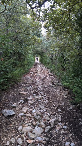 Nous dépassons les allemands qui se sont réfugiés dans les buissons pour nous laisser passer sur cette piste étroite, pleine de caillasses plus ou moins grosses, bien trempées qui roulent sous les roues et de la terre bien meuble.