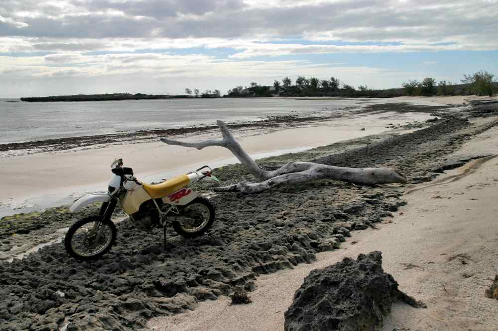 Nous partons tôt, sans bagages juste avec un casse-crôute, de l’eau et des outils, à Diégo nous récupérons Nanard et son 400XR pour commencer la ballade vers le nord. Nous sommes vite déçus par la végétation, de longues herbes jaunes couchées par le chaud vent d’est, des épineux, heureusement il y a aussi quelques sous-bois pour rouler à l’ombre. En remontant la côte Est, nous avons de beaux points de vue sur la grande baie en forme de trèfle quatre-feuilles. Les chemins sont caillouteux, cassants, et piégeux, surtout lorsqu’ils sont recouverts de cette herbe jaune, un coup de gaz mal dosé et c’est la chute, j’en ai fait l’expérience, sans les bagages on se sent des ailes.