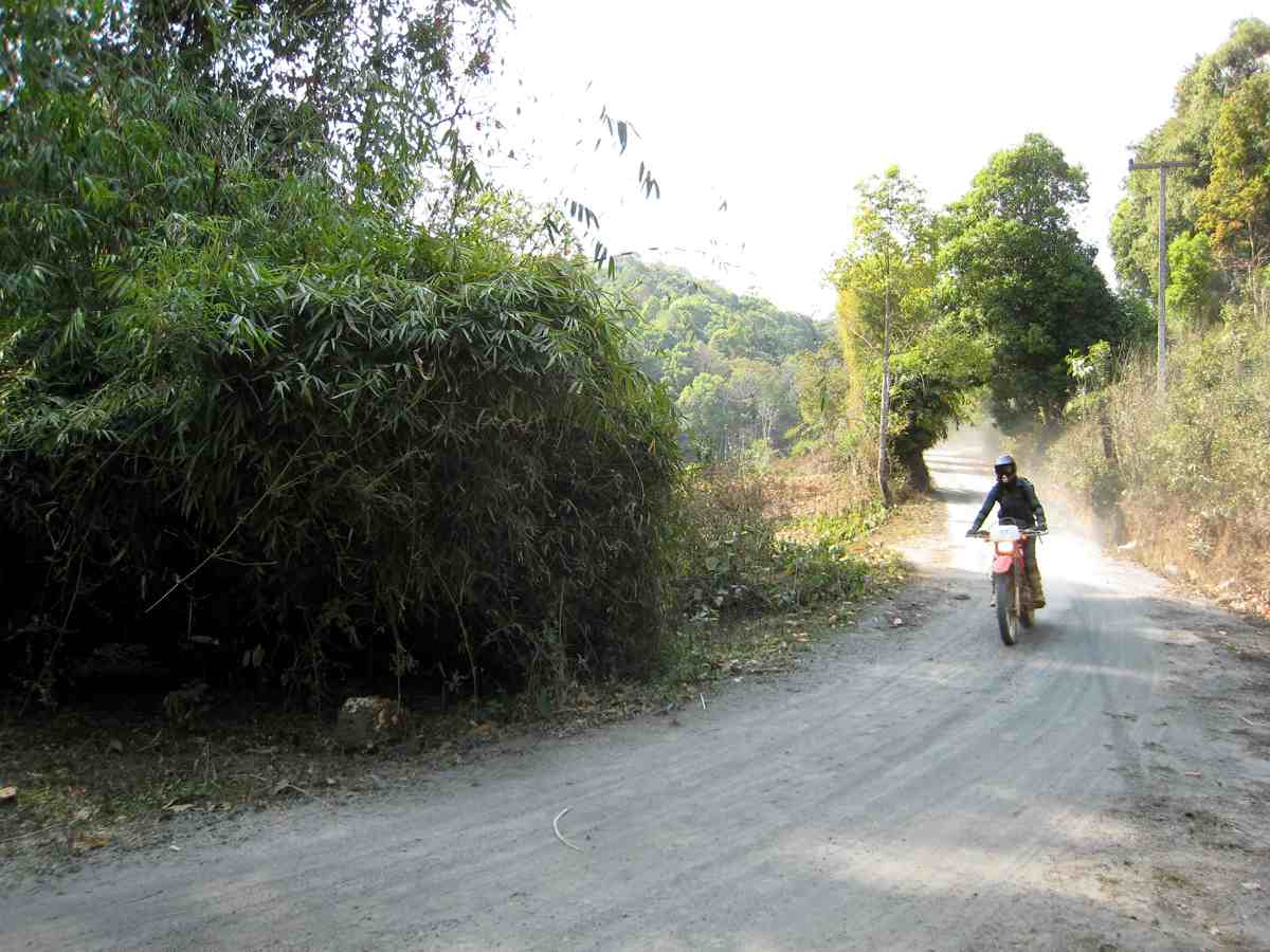 Après la route jusqu'à Wat Chan, les pistes nous rapprochent petit à petit de Chiang Mai , c'est le dernier jour, notre jeune guide Wut vers la fin de journée nous fait prendre une piste monotrace qui mène de Mae Sa Mai vers Doi Pui, çà fait un moment qu' il n'y est pas passé, ,un peu ignoré par les motards, c'est dommage pour les amateurs d'enduro, elle continue au sud jusqu'à Huai Rai.