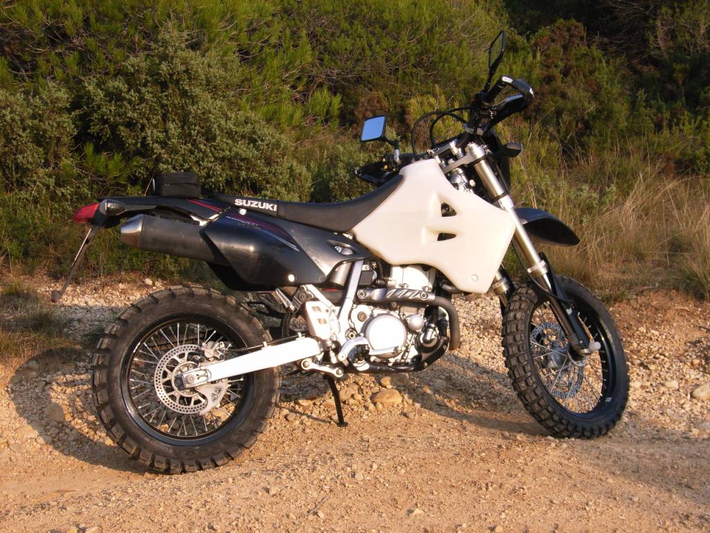 J'ai un DRZ 400 supermotard que j'ai un peu modifié ; roue de 19" à l'avant, démultiplication raccourcie, pneus à crampons et réservoir 16 litres: ça passe très bien sur toutes les pistes et chemins.