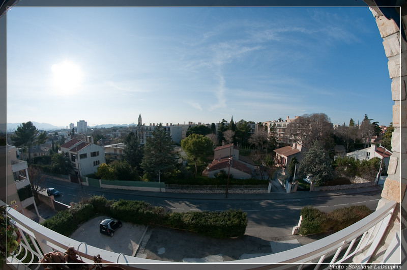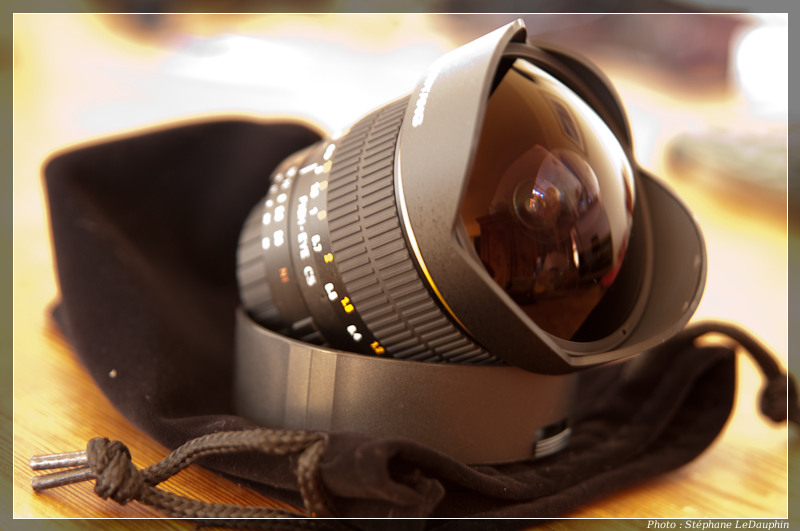 Je viens de faire l'acquisition d'un "Oeil de Poiskaïl", de marque Samyang pour une somme pratiquement dérisoire (220€). L'engin d'une focale de 8mm, entièrement manuel (mise au point et diaph.), joli construction (seul le pare-soleil est en plastoc, ça change). Il cadre plein format contrairement à certains de ses confrères (le rond du fish-eye http://fr.wikipedia.org/wiki/Objectif_fisheye ) et la projection utilisée limite les déformations en périphérie de l'image (projection stereographique http://fr.wikipedia.org/wiki/Projection ... ographique ). L'angle de champ est de 180° (diagonale de l'image). Reste à apprendre à l'exploiter, mais déjà pour le pano c'est top, le pano sphérique devrait pouvoir se faire en 5 à 6 vues seulement.